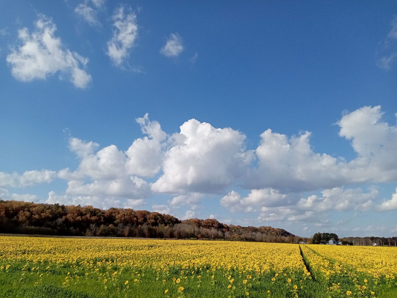 丘の紅葉が進む中、頑張って咲いている緑肥ひまわり。秋晴れの空の下まだ冬を感じさせない景色が広がっています。