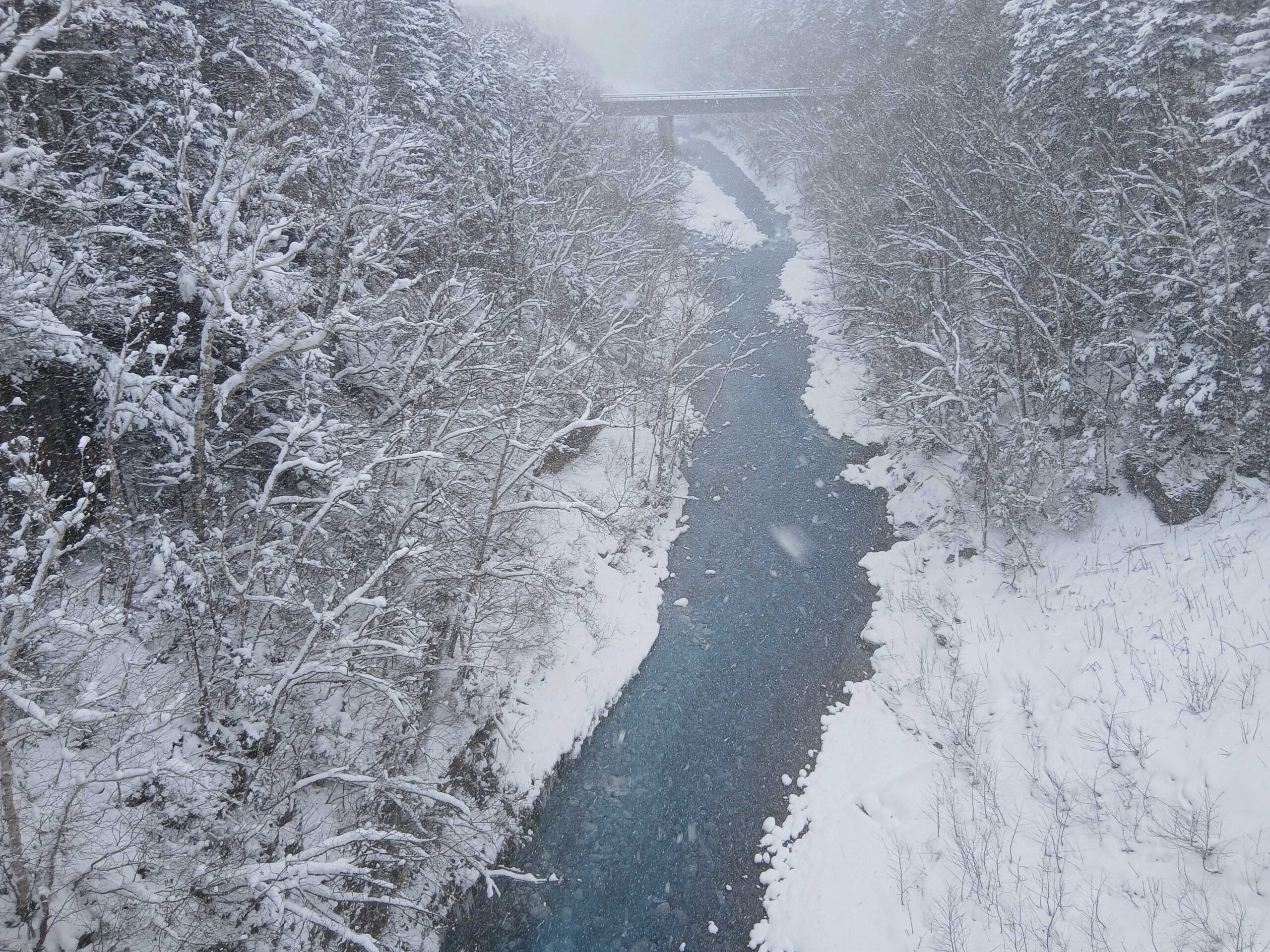 白く染まった木々と美瑛川の青が織りなす冬ならではの鮮やかなコントラストが広がっています。