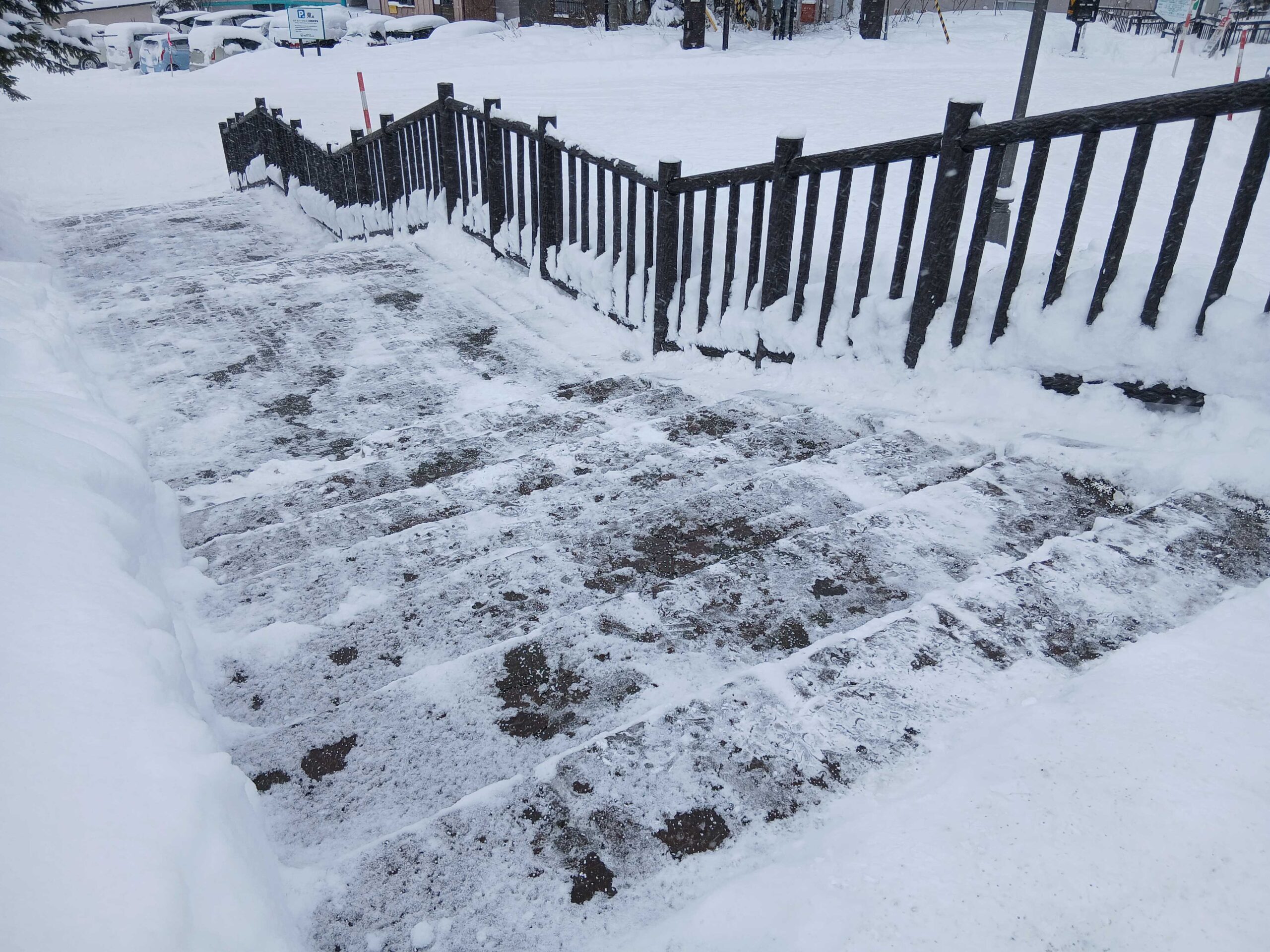 白ひげの滝へ向かう階段は除雪されていますが、路面が凍結して滑りやすい箇所がありますので
