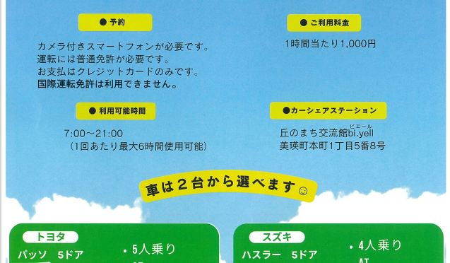 丘のまちびえいでカーシェアサービスがスタートしました!スマートフォンのみの操作で、予約、決済、鍵・車の受け渡しから返却までを無人で行う事が出来るサービスです。食事や観光スポット巡りはもちろん、テレワークやワーケーションの滞在中の足としてぜひ……