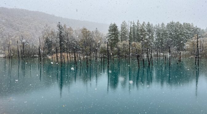 水の色は、若干碧がかっていますが、紅葉が、周辺の木々を染め始めています。遅れ気味の秋が、青い池迄やって来たようです。 (10/12撮影) ……