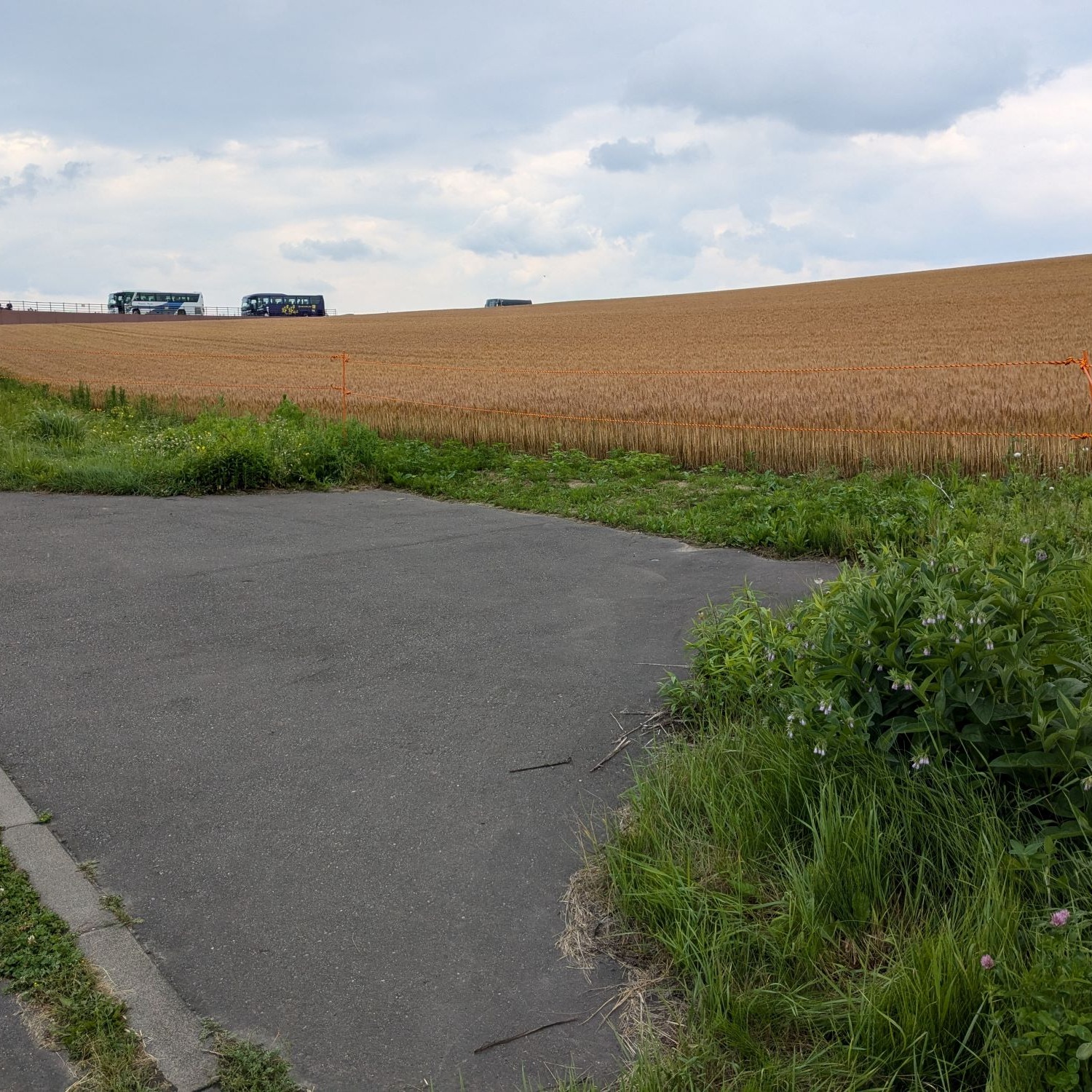 穂が丘一面に出揃った秋撒き小麦。この麦の穂が徐々に黄金色へと変化していきます。美瑛らしいパッチワークの絶景の丘もこれからいよいよ本番です! (6/9撮影 パノラマロード) ……