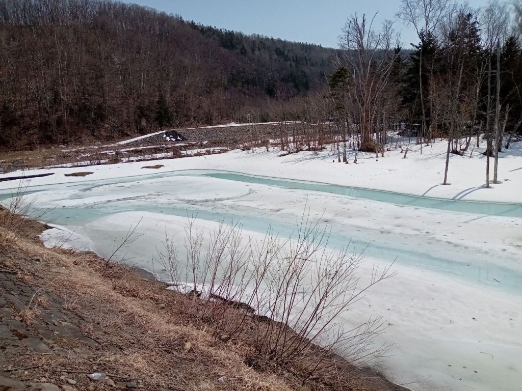 「白金青い池」は先週末の春の陽気と共に中央部分辺りからも雪が解けだしました。