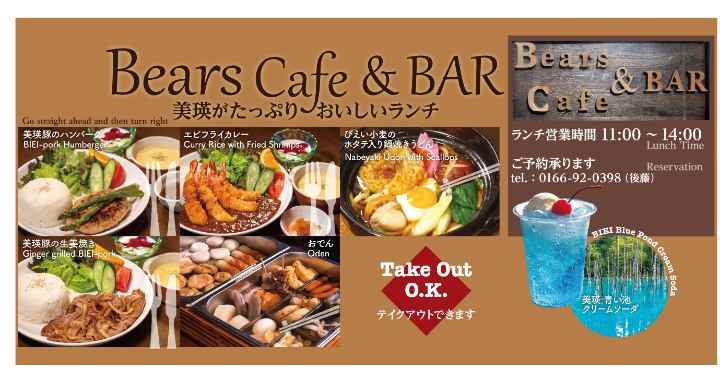 Bears Cafe&Barは、11時から14時までのランチタイムでは「びえい豚」を使った定食や人気の鍋焼きうどんなど、さまざまな料理を楽しむことができます。夜の19時からは、バーに大変身!カラオケも楽しめ、カウンターや個室でもくつろげます。飲み放題や歌い放題のメニューもあります。