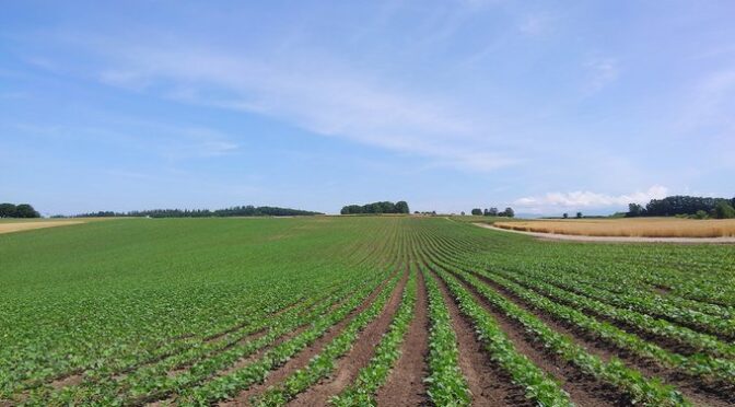 丘の区画を白や薄紫に染めているのは、じゃがいもの花。 お菓子等への加工用だと言う白い花をつける品種。純白の可憐な花の根元に、ホクホクの芋が実るまで、あとひと月ほどです。 ※見学は舗装路から。 土の部分には、決して入らないようお願いします。……