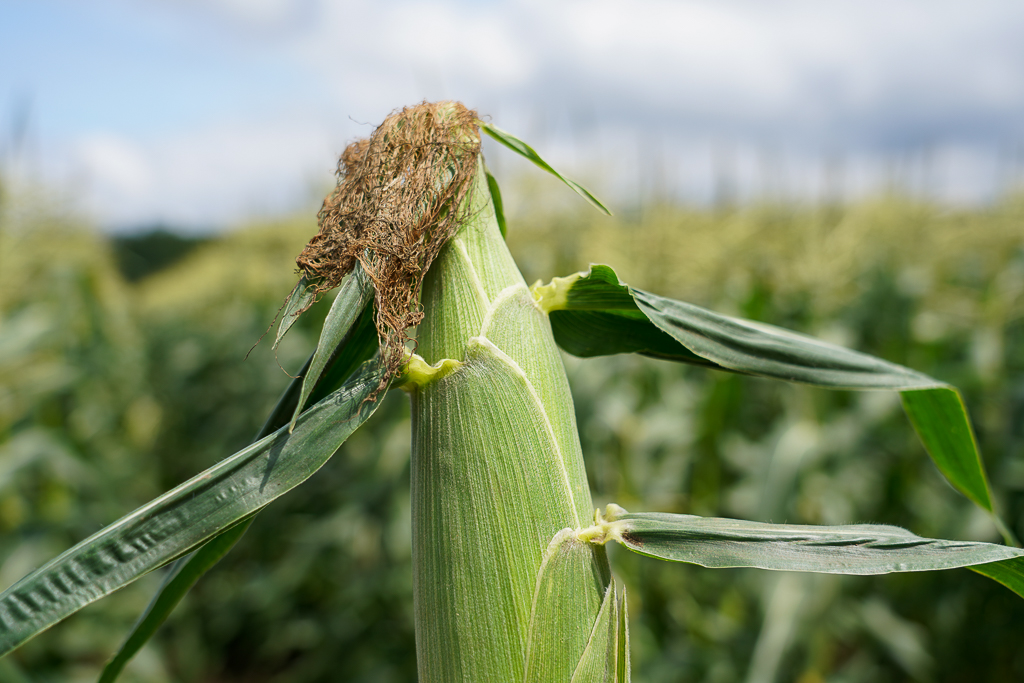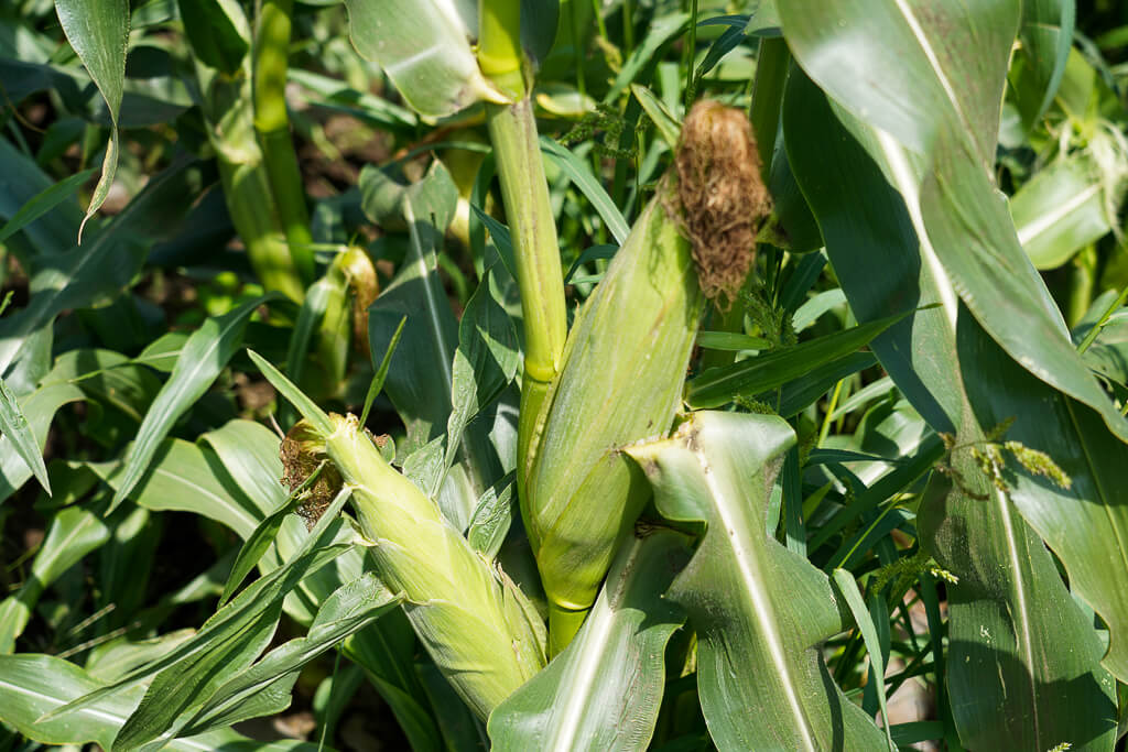 The “cornsilk” in this picture is brown, so this ear of corn is ready for harvest!
