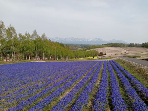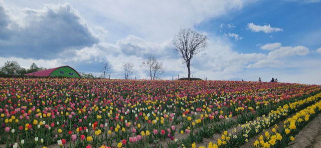 四季彩の丘では、菜の花やチューリップ、ムスカリが見頃を迎え、丘に彩りを添えてくれています。