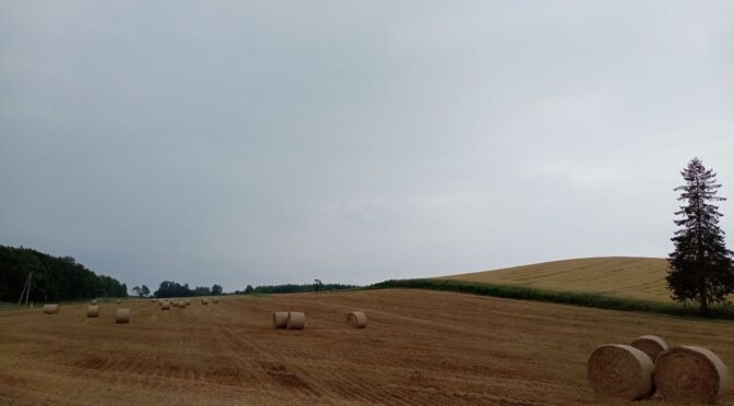 先週より秋撒き小麦の収穫が始まり、夏の風物詩「麦わらロール」が美瑛の丘に現れました。コロコロと転がっている様子はとても可愛らしいですが、重さは一つ300㎏以上!大変危険ですので、くれぐれも畑には立ち入らないよう、ご見学の際は必ず舗装された道……